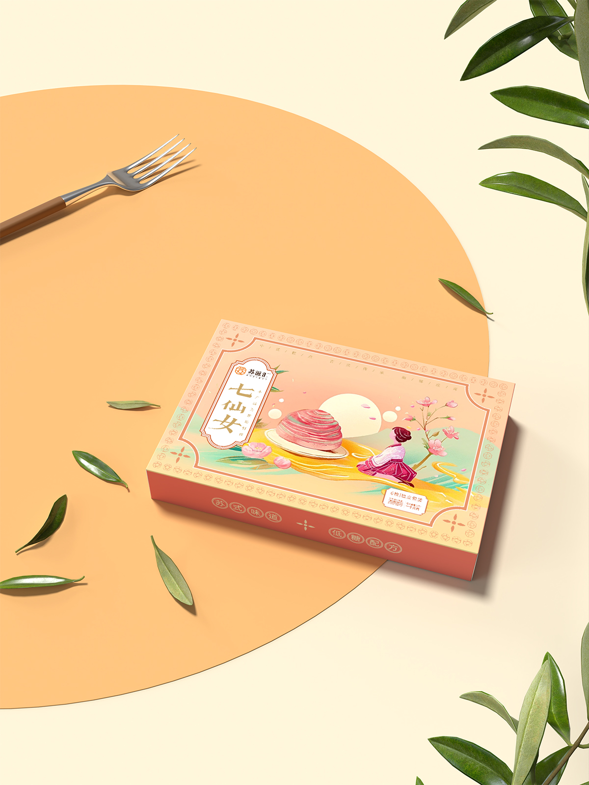 七仙女糕點包裝設計,以月圓之夜七仙拜月為背景,把玫瑰酥融合其中,通過鮮艷的色彩打造融合的范圍,突出產品賣點。經典傳承 手工彩酥,上佳用料,新鮮現(xiàn)制,手工秘制酥皮,薄如蟬翼,上佳用料,成就撲鼻好味道,餡料滿滿,沉浸式蘇式個糕點,霓虹云裳尋至味, 特為人間做好酥。