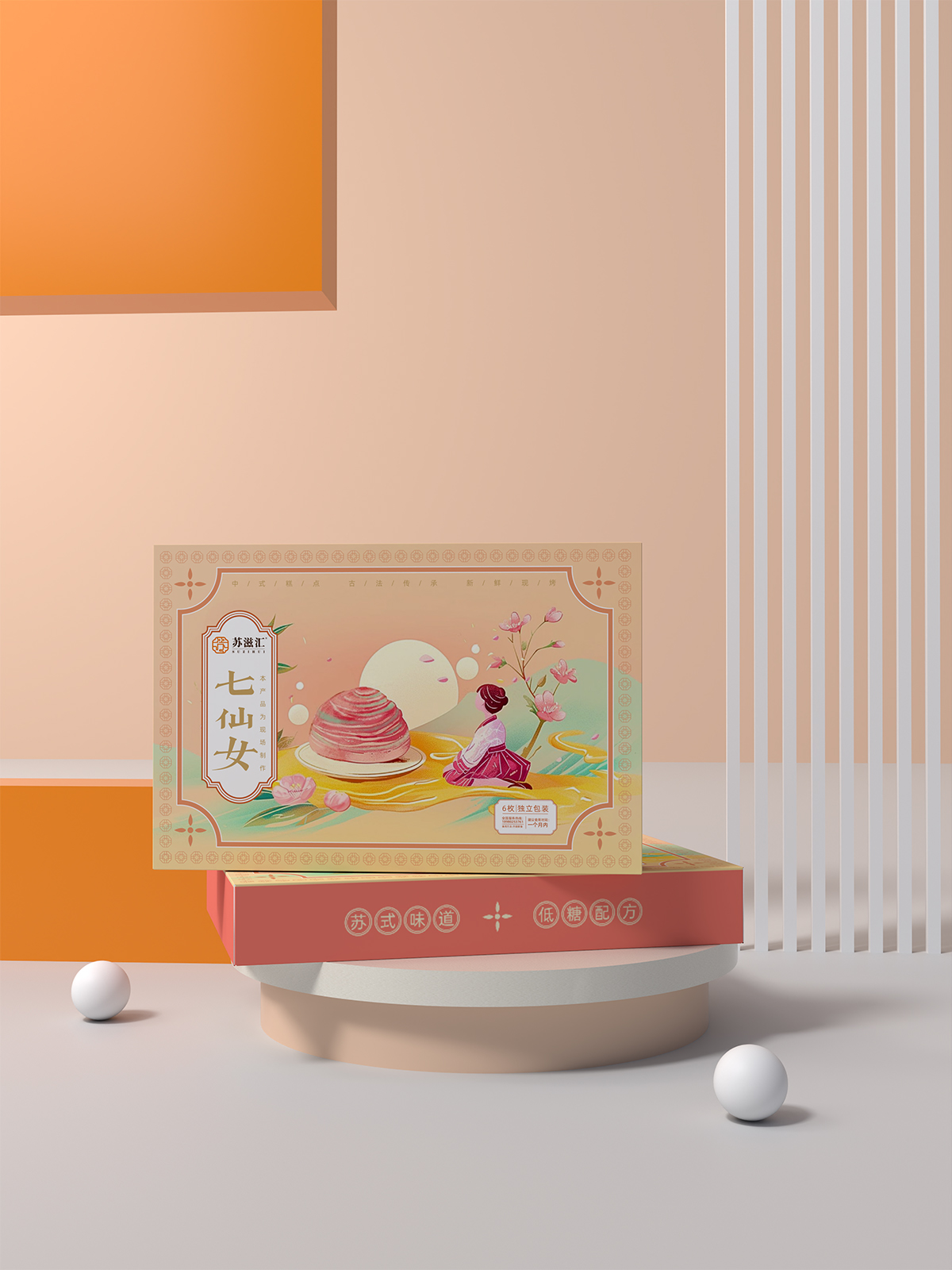 極地視覺為蘇滋味打造四款包裝系列分別為七仙女糕點包裝設計系列、七尋茉莉糕點包裝設計系列、荷塘月色糕點包裝設計系列、桃酥系列包裝設計等。
