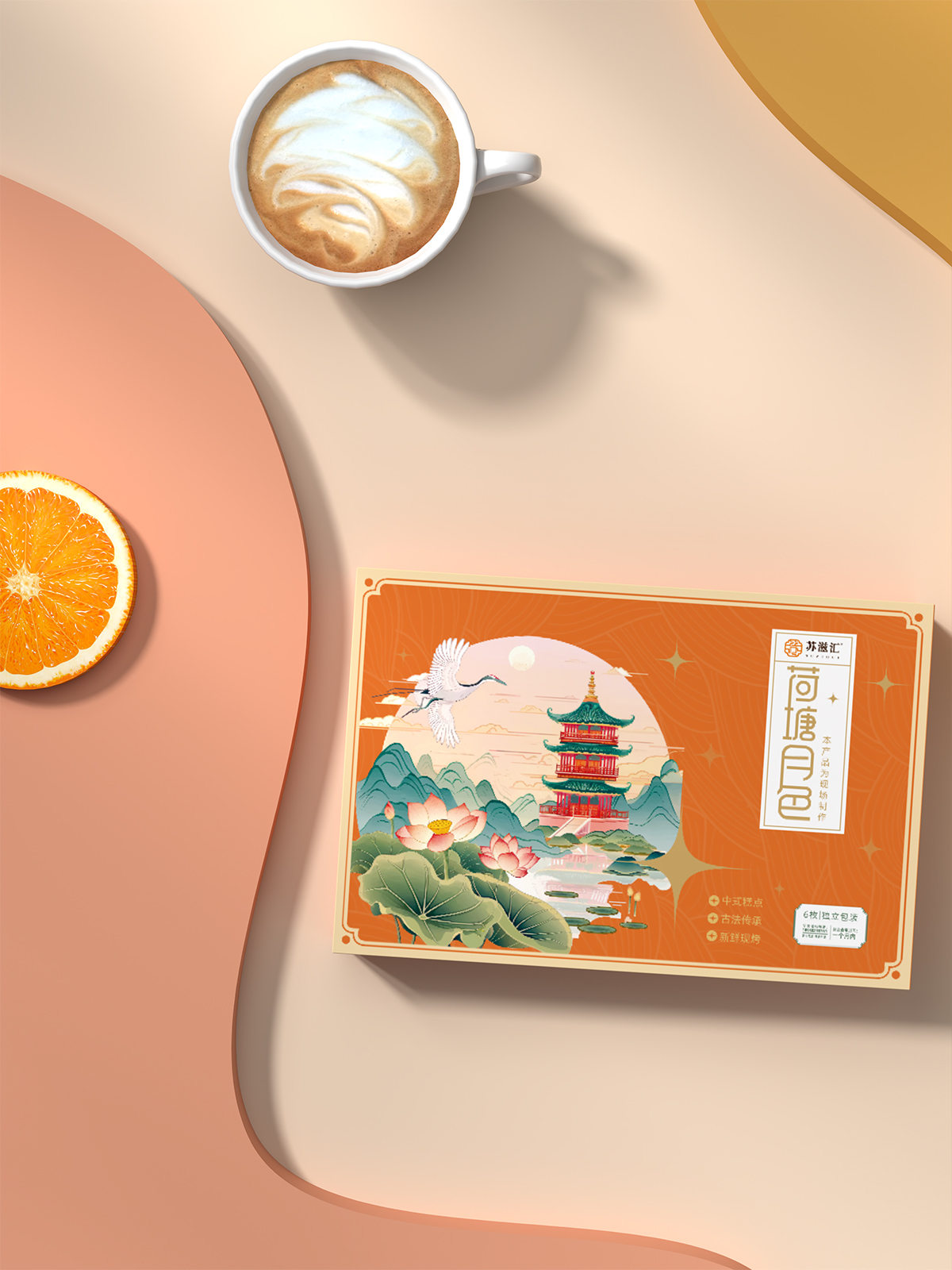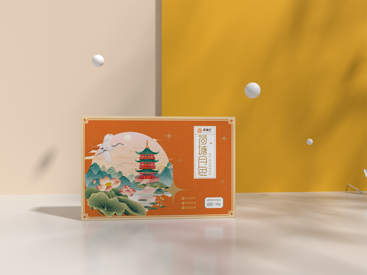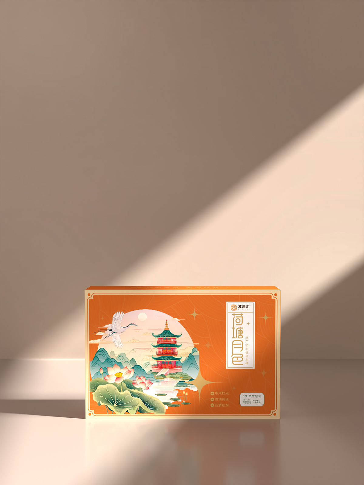 荷塘月色荷花酥包裝系列,傳統(tǒng)技藝 層層起酥 手工制作 回歸本真 酥皮融入健康果蔬粉調制 0天添加人工色素 遵守自然堅守原本 冰粉花色 清甜酥脆口感豐富。主體圍繞荷花 仙鶴以及蘇州園林景色進行創(chuàng)造。