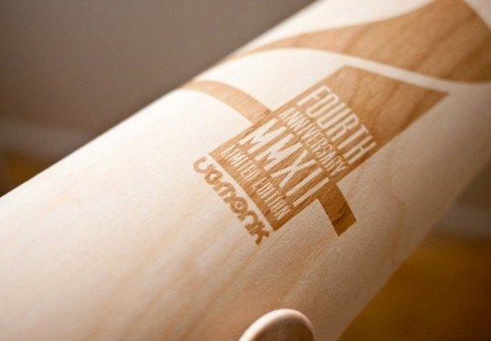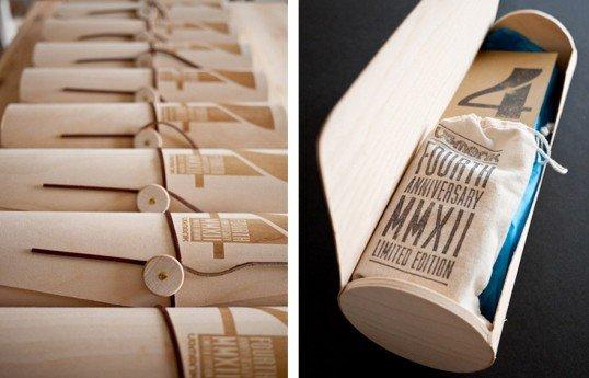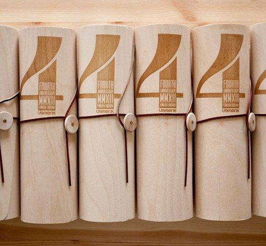 Ugmonk為慶祝其品牌成立四周年特別推出了限量款的t恤,200件100%純棉的黑色t恤被精心包裹在一個由白樺木皮制作的圓筒內,外側用激光雕刻出4周年的字符。包裝內還附贈了一個由回收銀杏木制作的紀念印章,一張帶有設計師親筆簽名和手工加蓋的卡片。