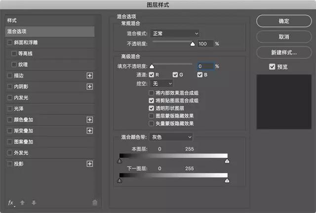 調(diào)整同一圖層的圖層樣式,在混合選項(xiàng)中將不透明度更改為50%,并禁用投影效果。