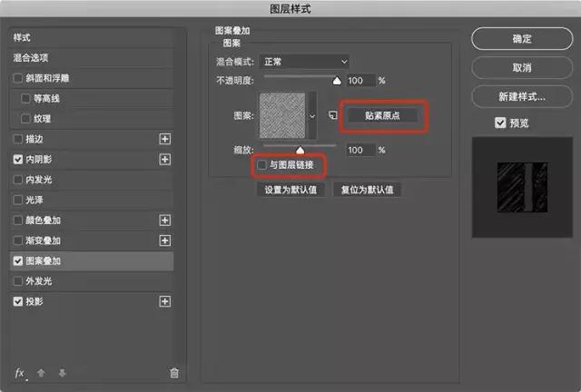 在Photoshop中返回原始文檔,然后再次選擇第一個(gè)文本圖層。使用剛才創(chuàng)建的圖案添加圖案疊加。取消選擇與圖層鏈接,然后單擊貼緊原點(diǎn)。