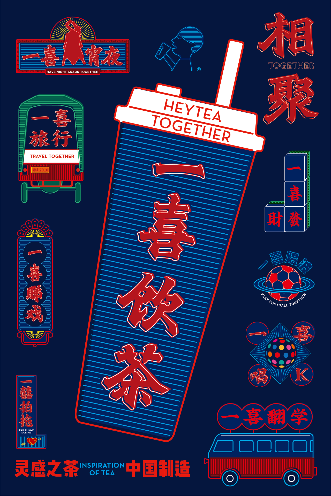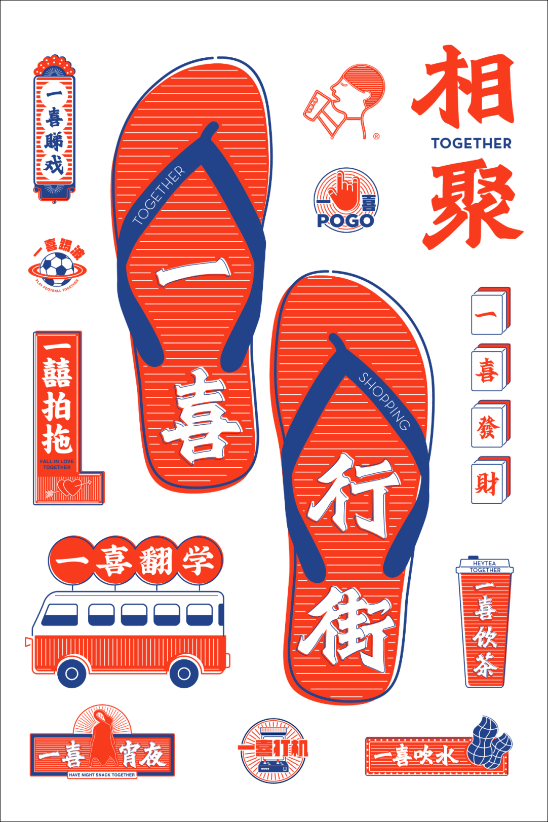 喜茶,一個被奶茶事業耽誤的設計公司,胡子,一個為五條人打造靈魂海報的設計師,同樣是誕生于廣東獨有的文化之下,這兩者相遇,會迸發出怎樣的火花呢?一喜行街主題海報:海報延續了喜茶一貫的風格,紅與藍的配色打造復古、簡約的意象,而“人字拖”、“牌匾”等元素,是五條人海報最常用到的東西,海報排版也似五條人海報一樣隨性。海報文案的粵語諧音也非常有趣:一喜睇(dì)戲、、一喜唱K、一喜發財、一喜飲茶、一喜宵夜、一喜旅行,體現了年輕人自由灑脫的生活態度。如果說上面兩幅海報代表 “白天”,那么下面這兩幅 “霓虹” 版的海報就帶我們開啟了 “夜晚” 模式。同樣的設計,因為顏色的不同,給觀眾的感覺也截然不同。喜茶的手提袋與奶茶杯一直都是他們的品牌亮點,將全新的設計融入包裝上面,再次展現了喜茶品牌設計的多元化。精致、小資的喜茶門店視覺,結合“紅白藍編織袋”背景墻,折疊桌、紅藍塑料凳等大排檔元素,這波反差,真是令人大開眼界這樣聲勢浩大的跨界。