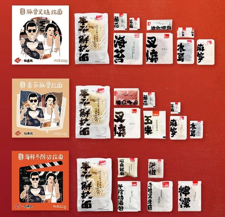 五條人和拉面說的聯名,設計依舊土潮土潮的。看這背景滿滿復古懷舊感的宣傳海報,一看就很“五條人”!包裝設計也是土潮土潮,包裝通過復古配色的漫畫形式呈現了樂隊成員茂濤在吃面和穿著白背心的仁科在打電話的場景,借用了五條人喜歡打電話的梗。而三款不同口味的包裝,用音、影、書的概念來設計。分別以“光盤”、“場記板”和“書”作為框架元素,增加了趣味。打開包裝,里面除了泡面教程以外還附上一句“土味情話”,比如以下這句:“阿面愛上阿條,在一個睡不著的夜晚。”有多少人看著文案不禁哼出來的。除此之外,宣傳海報的設計,也是非常地接地氣,海報整體采用了具懷舊感的色調,主體為這次聯名款的新包裝和冒著熱氣的實物拉面為主,而背景則采用舊風扇、舊電視機、收音機等具有年代感的物品渲染氣氛。可以說,當接地氣的五條人和具煙火氣的拉面說結合,兩者的氣質非常地融洽了。