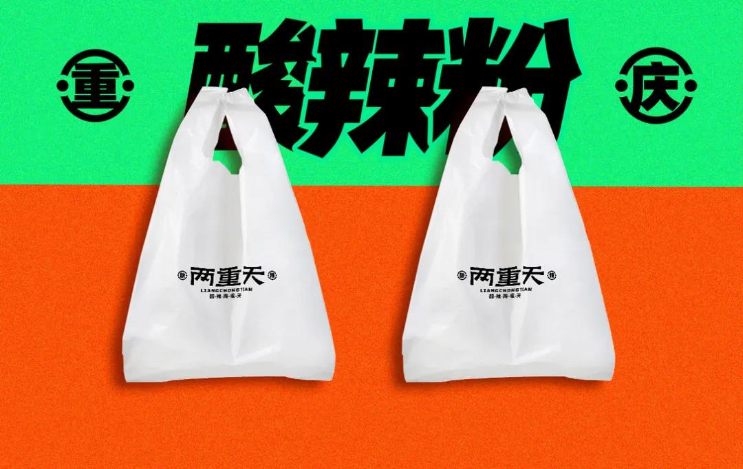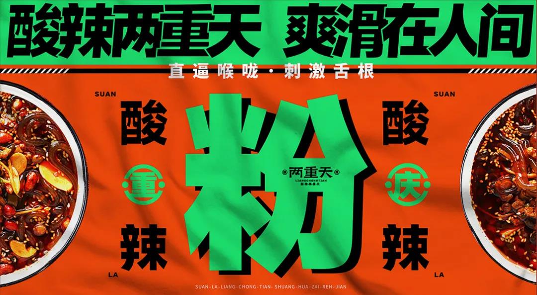 這個(gè)酸辣粉的品牌LOGO,是簡潔的幾個(gè)字體組成,用排版順序的重次增加視覺效果。而Slogan“酸辣兩重天,爽滑在人間”,表層字眼的文案,有著“簡單粗暴”的勁爽。