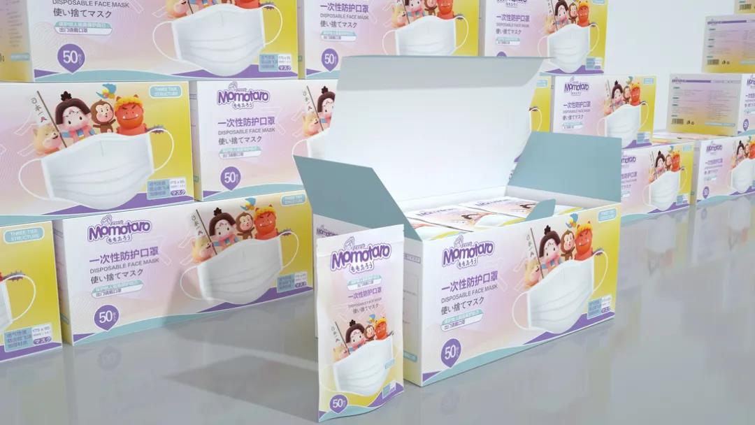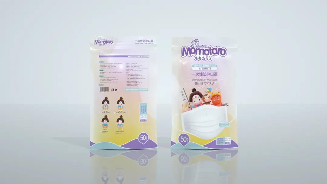 日式風格的口罩包裝,插畫IP靈感來自于日本五大童話之首《桃太郎》,生動勾畫出五個主要動畫形象,街知巷聞的故事性場景貼近生活。