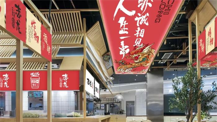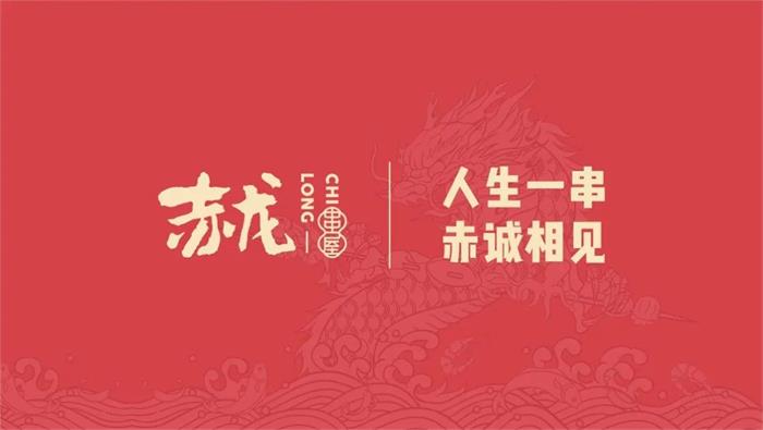 這個炸串品牌叫赤龍炸串圍繞赤龍的品牌名,原創手繪出一條翻江倒海,爪持串物的龍形象,LOGO設計是中文字體和拼音的結合,赤龍二字用毛筆揮斥而成。赤龍的拼音在和串屋二字連結,重在突出赤龍的品牌名稱。輔助圖形采用日式匠心經典“燒鳥”造型,結合本地傳統炸串演繹誕生出新一代解饞美味。不論是獨自一人釋放對食物垂涎的欲望,還是與老友相聚發泄日常生活的某種情緒,擼串無疑是釋放的最佳途徑,所以赤龍炸串提出了人生一串,赤誠相見的廣告語。
