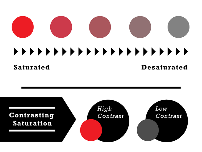 色彩強度也叫作色彩飽和度。當(dāng)顏色達(dá)到最純最亮的時候,我們就說這種顏色100%飽和,而如果一個顏色越灰它就越不飽和。亮色和暗色無論是單獨還是搭配使用都能有效地在設(shè)計中形成高低對比。亮色總能吸引人的注意,尤其是當(dāng)它以黑色為背景的時候,因此你可以用亮色來強調(diào)設(shè)計中的重要部分。