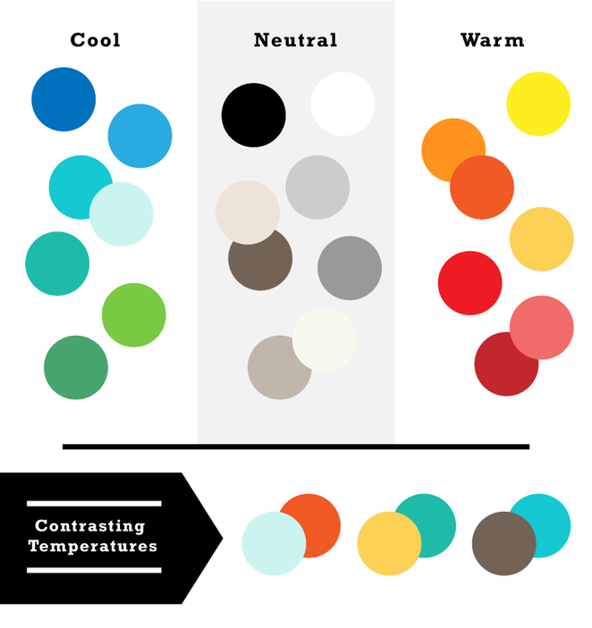 顏色可以根據(jù)色溫分成幾個類型:暖色、冷色和中性色。紅、橘、黃屬于暖色;藍(lán)、綠為冷色;黑、白、灰為中性色(在某些情況下淡棕色和棕色也屬于中性色)。在設(shè)計種加入不同色溫的顏色搭配可以創(chuàng)造出強烈的對比效果,特別是冷色和暖色搭配。