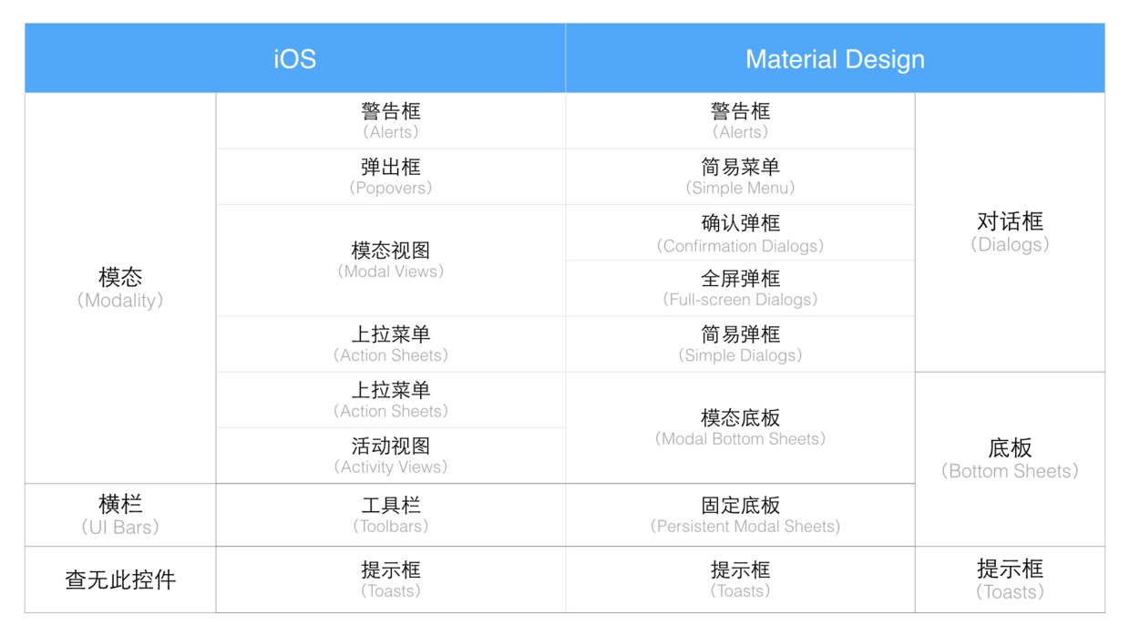 觀察上表,左邊iOS這一欄,從警告框到活動視圖,它們構(gòu)成了一個聽起來很高大上的詞匯——模態(tài)(Modal,不是Model)。iOS設(shè)計規(guī)范對模態(tài)的定義是這樣神兒的:模態(tài)讓用戶聚焦到某一個任務(wù)、消息或者視圖上而不能做別的事情,直到用戶完成了當前的任務(wù)。比如警告框,用戶必須必須選擇警告框里的一個選項,警告框才會消失,否則用戶什么也做不了。這個警告框,就創(chuàng)造了“模態(tài)”的體驗。