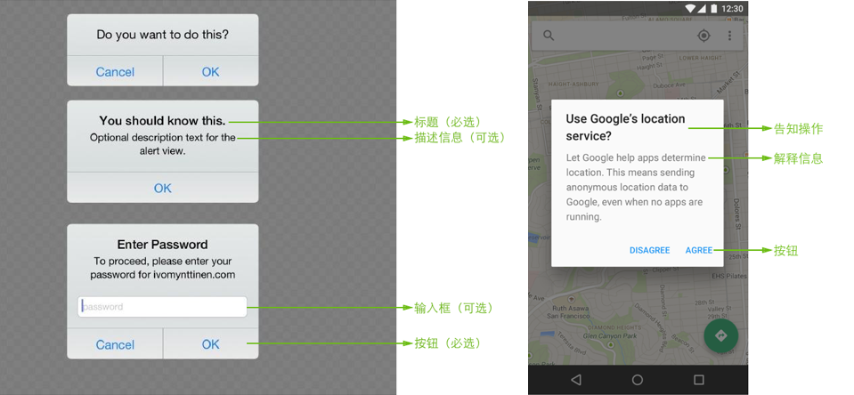 左:iOS警告框; 右:MD警告框