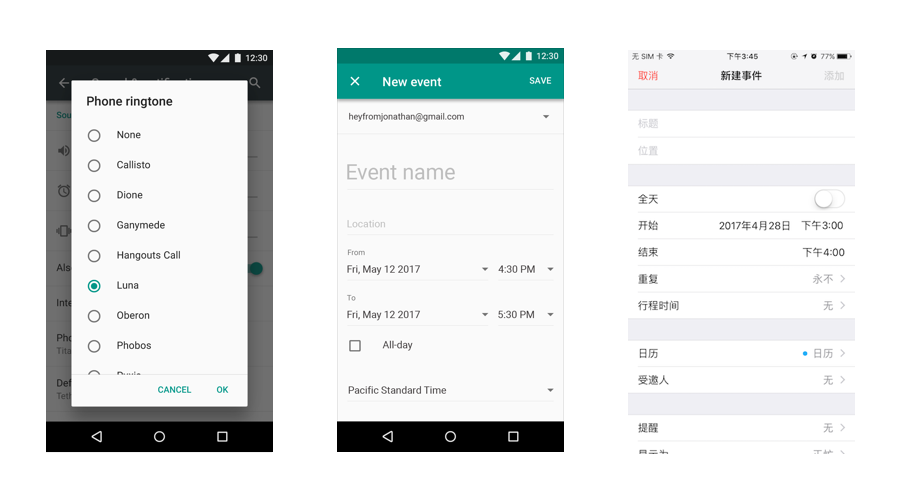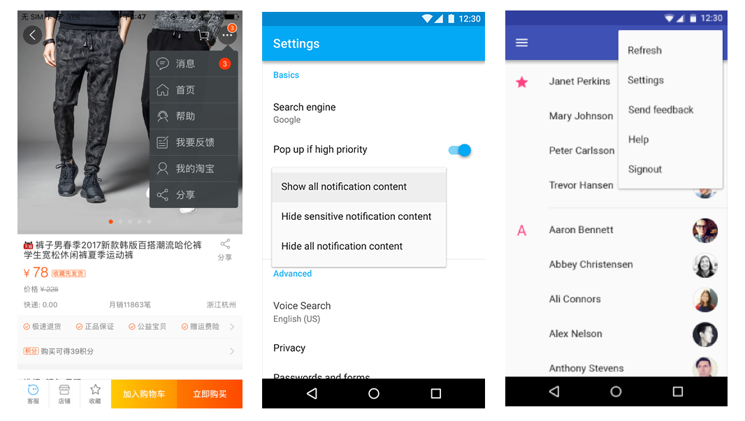 左:iOS彈出框; 中、右:MD簡易菜單