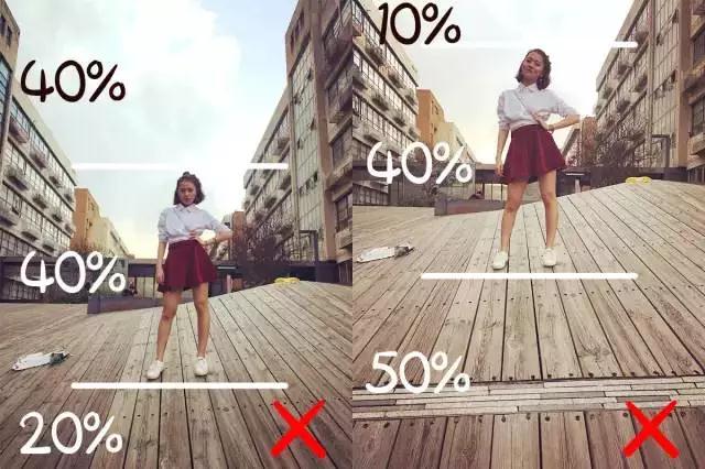腳部貼近照片底部,頭部留空40%,才是站著顯腿長的正確構圖姿勢,如下圖