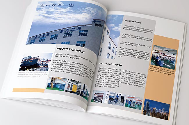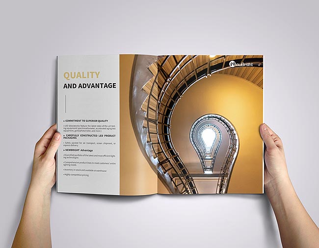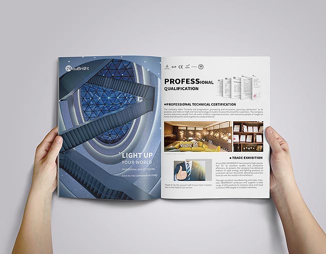 照明產品宣傳冊在進入介紹品牌鏈上的產品前,對企業概況的描述是必不可少的,畢竟并不是每一位讀者都是你的老客戶,對你公司的充分了解。對照明公司的簡介文案刻畫上也要突出公司實力為主,并且適當的融入企業文化,增進照明銷售代理商對企業的信心。宣傳在進入照明產品設計排版的時候,需要簡約處理,清晰的識別產品的參數型號以及各項指標,方便快速的索引目錄是成功的關鍵。