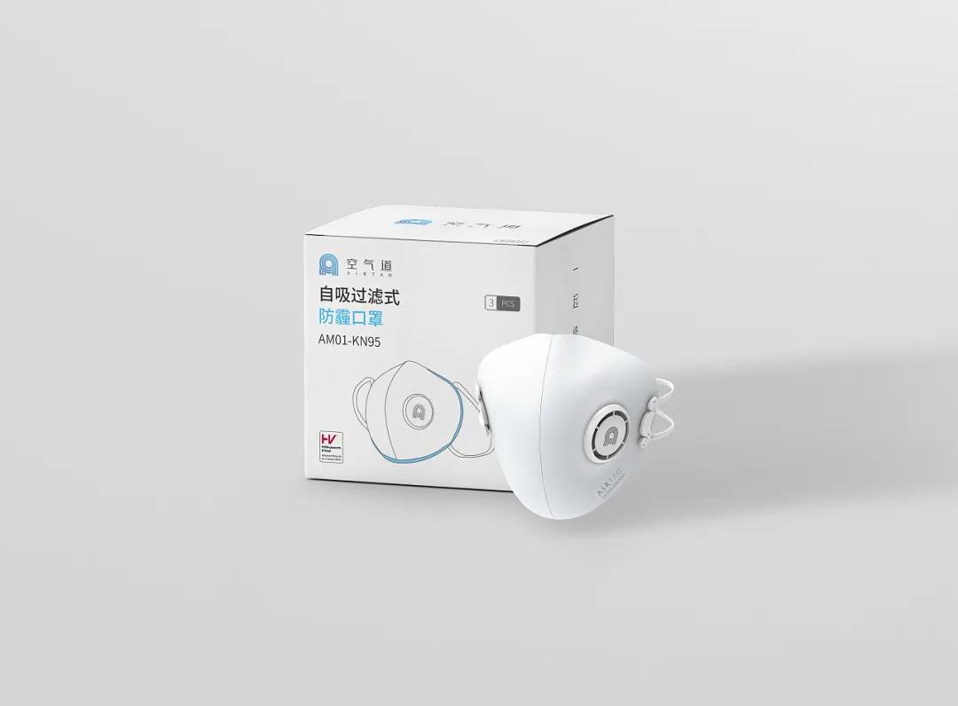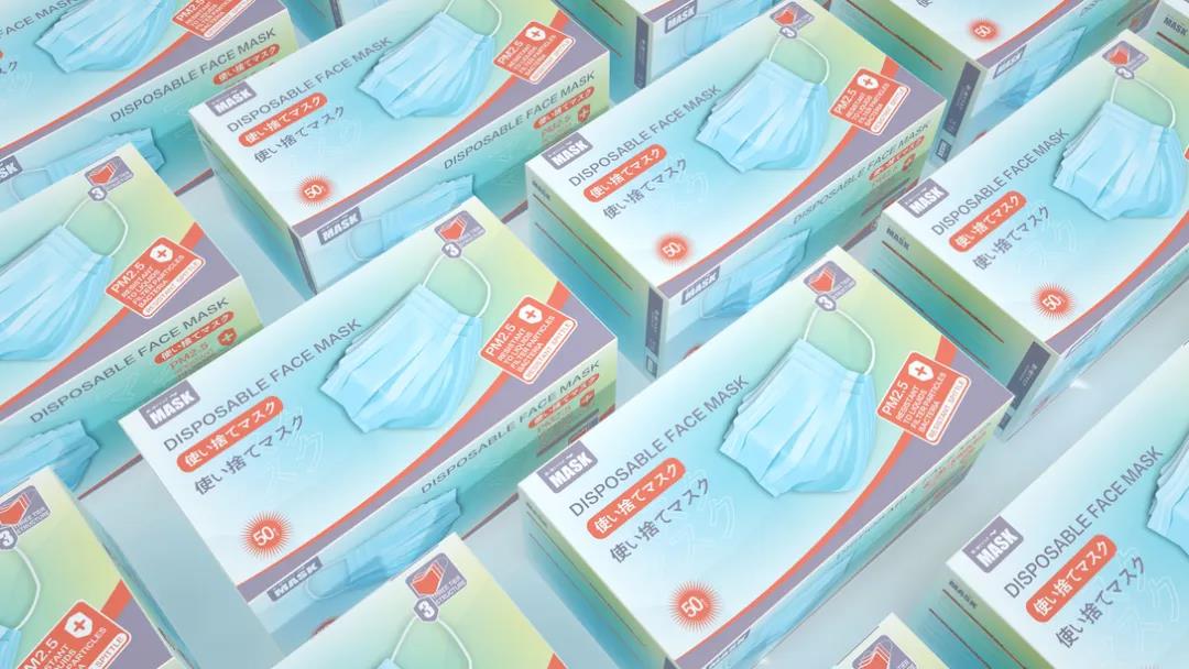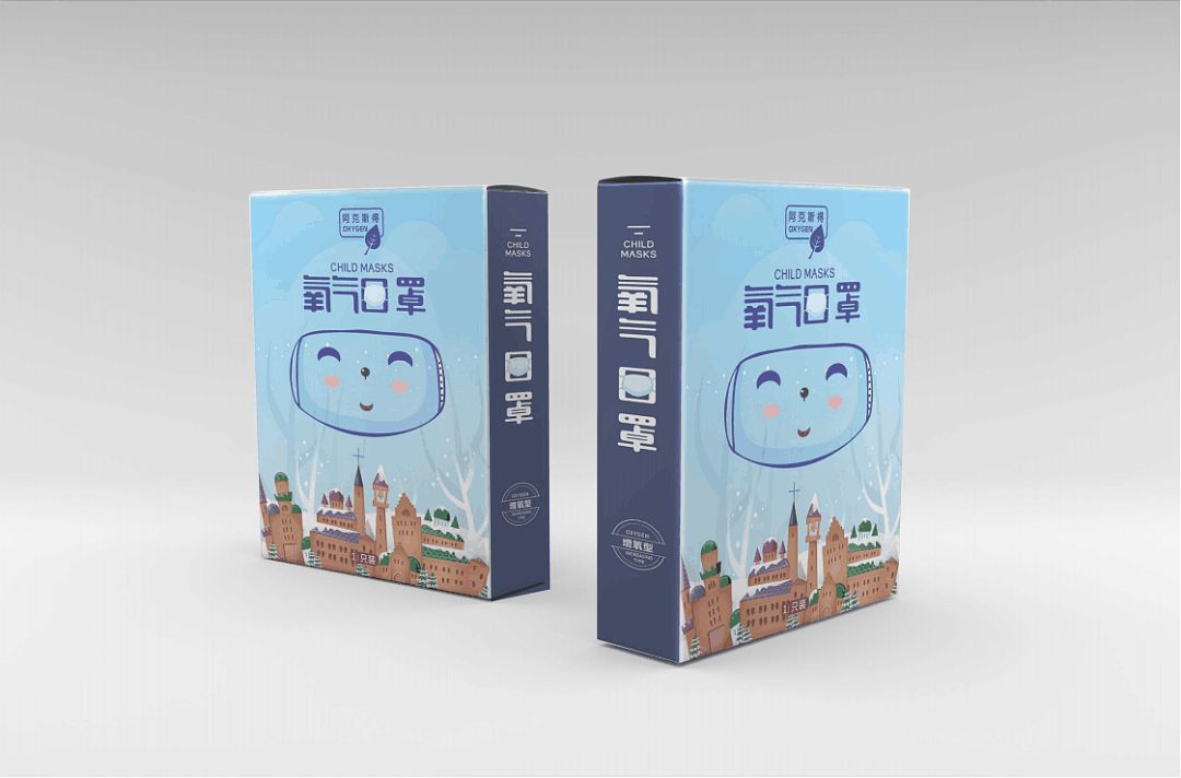 極簡白的立體包裝,整體設計更加小而精致,正面插畫的口罩外觀形象直接簡單,加入藍色描邊使口罩更有辨識度。