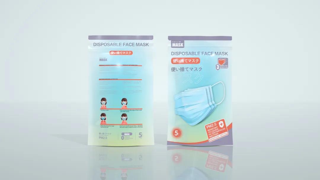 這款包裝較為清新簡約,同樣使用漸變層次的設計豐富了包裝內容,口罩的立體設計突出明了封面的文字,標記采用不同顏色重點分明,消費者可一目了然,滿足需求。
