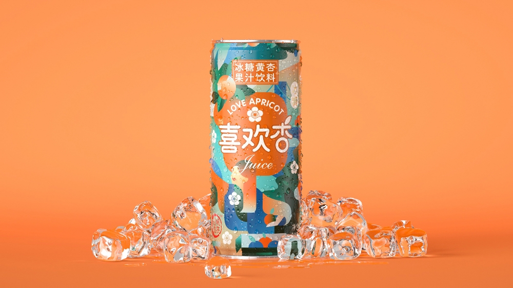 包裝設(shè)計(jì)中插畫(huà)用現(xiàn)代手段把杏林產(chǎn)區(qū)描繪得時(shí)尚浪漫。在冷色調(diào)整體布局中穿插溫暖黃杏,以冷暖色的結(jié)合突出杏汁的酸甜口感,形成印象深刻的清新質(zhì)感。