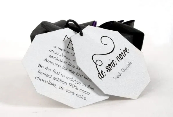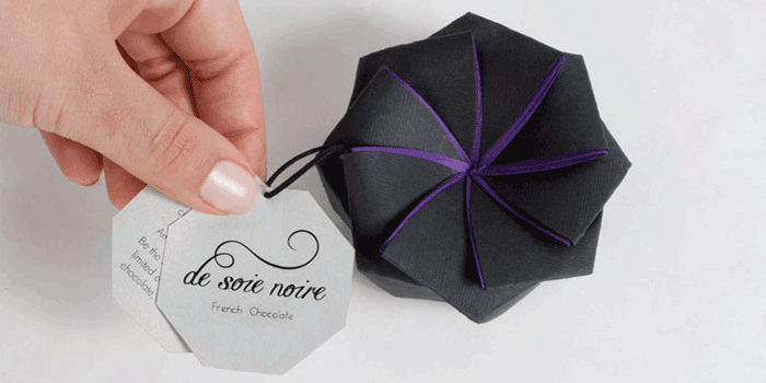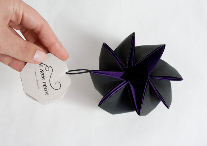設計師將包裝紙疊成了八瓣花形,只要牽動標簽,花瓣包裝就會巧妙的隨之慢慢綻放開來,這里的巧克力在花瓣眾星拱月的襯托下,自然而然也就成了花瓣中所包裹的花蕊。