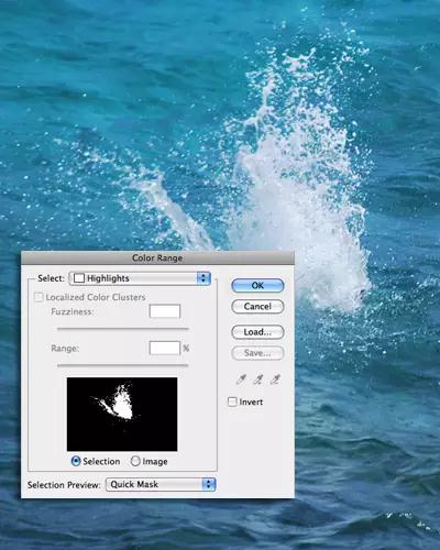 選擇> 顏色范圍,利用顏色拾取器單擊對(duì)象。在這個(gè)例子中,我單擊的是水浪的白色區(qū)域。