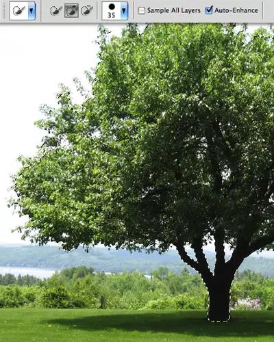 接下來(lái),使用細(xì)化邊緣工具沿著選區(qū)的邊緣進(jìn)行描繪。對(duì)于樹(shù)葉部分可選用大尺寸畫(huà)筆,而有明顯輪廓邊緣的樹(shù)干部分選用較小的畫(huà)筆。還可以移動(dòng)調(diào)整邊緣滑塊對(duì)邊緣進(jìn)行光滑、羽化或硬化處理。