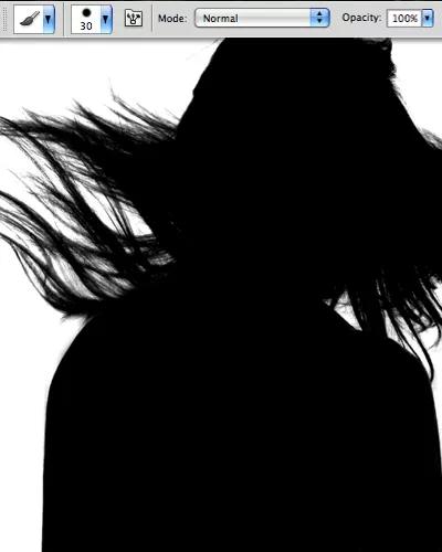 接著,使用一個(gè)黑色的畫(huà)筆補(bǔ)全模特身體的其他部分,白色畫(huà)筆用于描繪背景中的暗色區(qū)域。