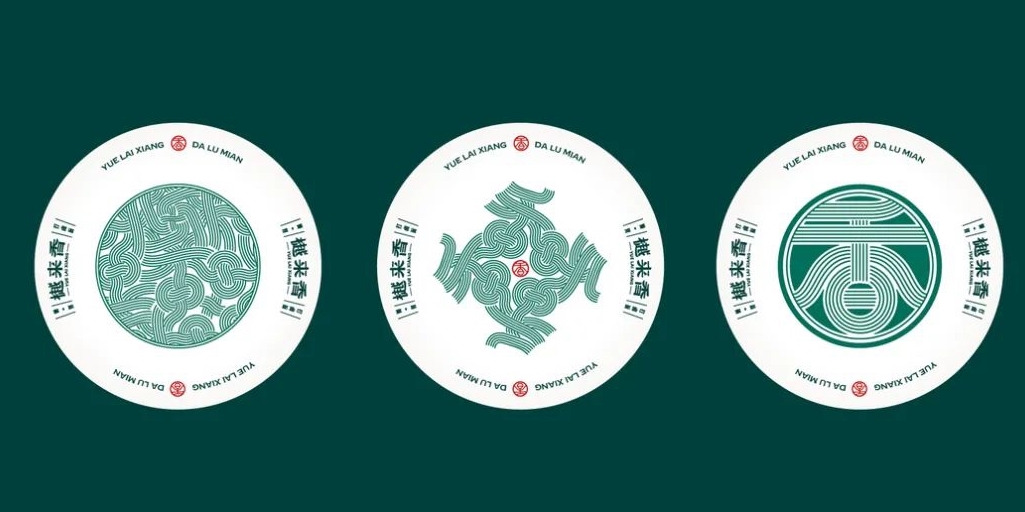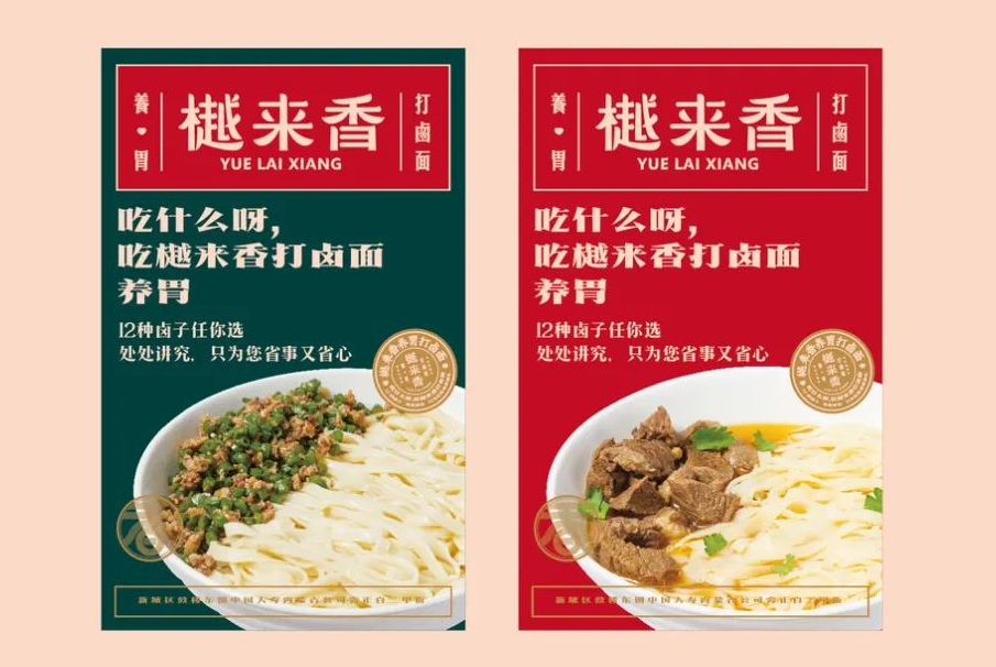 樾來香養胃打鹵面作為呼和浩特市地域性品牌,品牌定位為“打鹵面”這個品類,除將面條本身做到扎實之外,對于面的靈魂“鹵子”能做到沒有上限的創新空間,也給消費帶來更加新鮮的味覺刺激。LOGO設計以純文字為主,樾來香三字加大加粗置于LOGO中間位置,線條柔軟,與面給人的感覺一樣,字形中各有一處斷口,似是要打破某一種連貫的感覺,英文字體與底下的廣告語都是板板正正的,總體LOGO中規中矩,不算出彩,但勝在簡潔明了。品牌采用了墨綠色、青綠色、杏色和金棕等顏色,整體色調是比較清新的,看起來清爽又不失味道,還是很容易給消費者留下好感的。在匹配符號時選擇了“香”這個概念,香是品牌的符號,讓人記住品牌,樾來香不好記,不好傳播,變成一個香字符號變得更容易傳播,讓香=樾來香,形成聯想和記憶。品牌輔助圖形設計中,很好的運用了面條這一元素,不論是香字的造型還是其他延伸圖案,因為有了面條線條的加塑,更加能體現面這一品類,奇特的造型也讓設計與其他面食品牌有了一定的差異性。輔助圖形與LOGO的結合中,香的符號格外明顯,面條的元素也展現的很完整,這是對品牌符號和品牌品類的加強。圓形輔助圖形還有這一款強調三無的圖案,由中間的橢圓形中心,向圓的四周發射擴散,紅色的內容很是顯眼,正好突出其強調的三無。樾來香的輔助圖形眾多,這一套輔助圖形是用手繪的方式,將品牌的底氣和堅持繪制出來,優質面粉、自有牧場和新鮮蔬菜,繪制簡單,卻很有力量感。