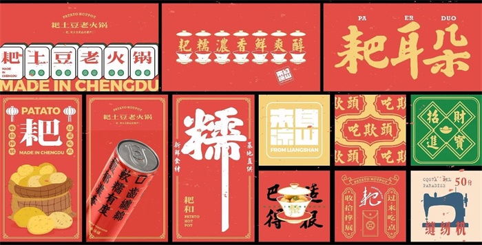 這家叫耙土豆老火鍋的火鍋品牌以土豆作為主角,打出“耙,是土豆最后的尊嚴!”的口號,告訴人們土豆就該“耙”著吃。這套VI視覺設計是土豆、麻將、懷舊玩具等元素的集結,充滿市井的感覺。顏色搭配上,以番茄紅為背景色,搭配土豆色的字體,既有扁平硬朗的字體樣式,也有菱角分明的字體。