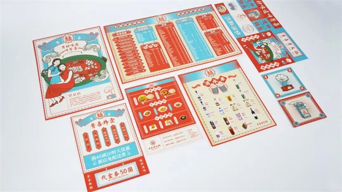 菁喜火鍋新的LOGO設計打破了舊式標志古板、規整的框線,將字體放大化并作為主視覺,采用了民國風的顏色、插畫以及版式,和低飽和度的紅、灰、藍色調,突顯出該品牌的特色,運用了對稱的版式設計,結合新民國風的人物插畫形象,使民國風更加鮮明。利用對稱連續的紋樣,加以線條豐富其設計形式,延續了品牌的復古民國風調性,喇叭留聲機、紙盒飲料生動還原了新民國時期的生活氣息。放射線的復古底版設計,搭配新鮮豐盛的食物,突顯了視覺印象,使畫面飽含跳躍感,加深了消費者對產品的印象。