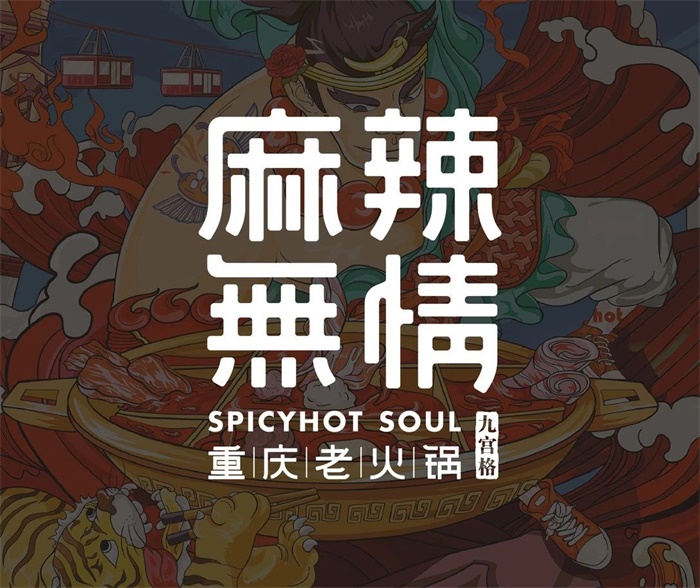 麻辣無情重慶老火鍋這家主打“麻辣火鍋”的餐廳,同樣以年輕群體為主,故用辣椒紅作為品牌的主色調以刺激消費者的食欲。采用繁字體進行設計的品牌標識,slogo“夠麻辣 才霸道”,以更強烈地確定品牌的調性和認知度,用“霸道”來詮釋重慶文化的江湖氣息。該品牌還針對重慶的江湖地域特性,和火鍋本身傳達的“熱鬧”“爽辣”屬性重新設計了“武松”這一江湖俠客形象,同時還設計了輔助圖形,包括重慶著名景點的元素等,以更有力的視覺符號提高品牌設計的識別性。