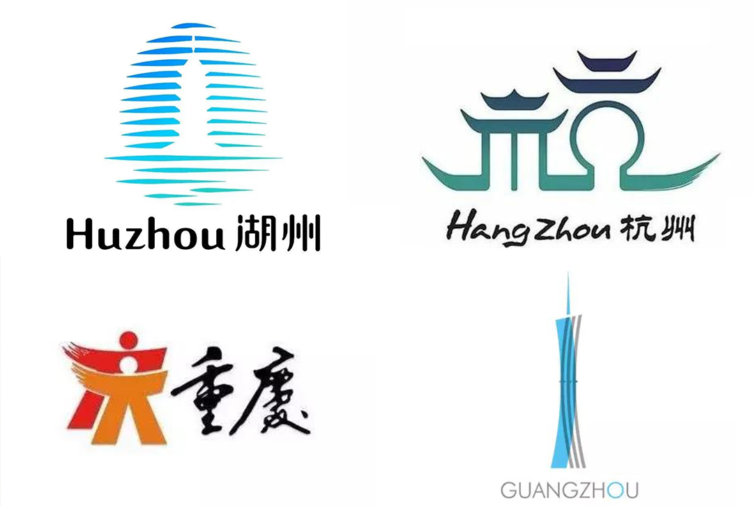 我第一個感覺就是視覺上想要傳遞的信息太!多!了!插畫設計結合各種元素呈現畫面這個操作還算是合理的,但是——LOGO設計給人的感覺就是拼湊元素式地匯聚城市特色。這繪制的節奏就像是先來個具城市特色的梯田和山脈,再把建筑特色添上,最后加上些鳥來豐富一下,完事!整個設計傳達的信息太多,給人一種“眼花繚亂”的感覺,這樣反而讓人毫無印象,記不住。所以,在LOGO的設計上以簡化的形式去呈現城市特色反而更直觀明了。像湖州城市LOGO,以剪影的形式結合了現代化地標“月亮酒店”,傳統標志性建筑“飛英塔”及太湖三大元素。LOGO通過采用統一的線條描繪風,使這些元素形成一個整體視覺上傳遞了城市文化,又不失簡潔大氣。杭州城市LOGO,以漢字“杭”的篆書進行演變,融合航船、城郭、建筑、拱橋等元素,以“字+圖形”結合的形式,達到了簡化。重慶城市LOGO,采用了“人”為主要視覺元素,雙人組成了一個“慶”字,并且“人人重慶”如今也成為了城市形象標志。還有廣州城市LOGO,直接運用具地標性建筑廣州塔融合“州”字設計。可以看到以上這幾個城市LOGO雖然看起來很簡潔,但是傳達的城市文化含義厚重。
