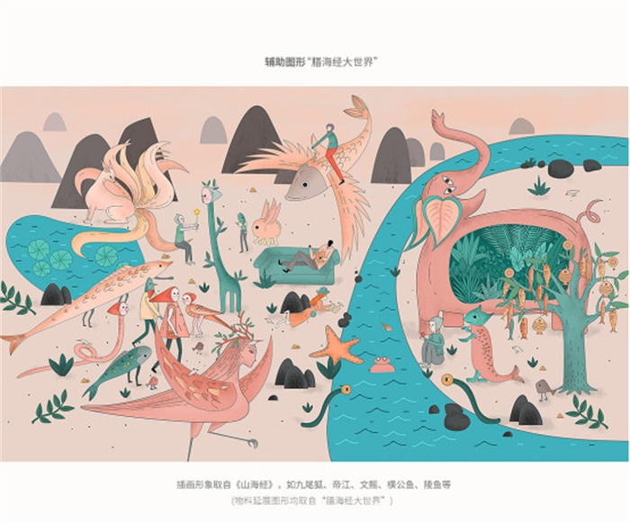 膳海經VI設計,該零食品牌面向年輕群體,為了迎合年輕人的喜好,采用插畫的設計形式進行包裝設計。“膳海經大世界”是借助山海經的形象進行創作,想要展示一個不受世俗約束的樂園,同時,顯現出膳海經食材豐富,山珍海味無奇不有。標志整體形態由圖文組成,圖的形態由輔助圖形中的動物與植物圖形組成,展現一副生機勃勃的景象,強調品牌是原生態、純天然的綠色食品。文字由品牌名“膳海經”組成,線條簡約,兼具現代時尚感和中國風韻。傳遞品牌立足現代,傳承傳統文化的品牌宗旨。