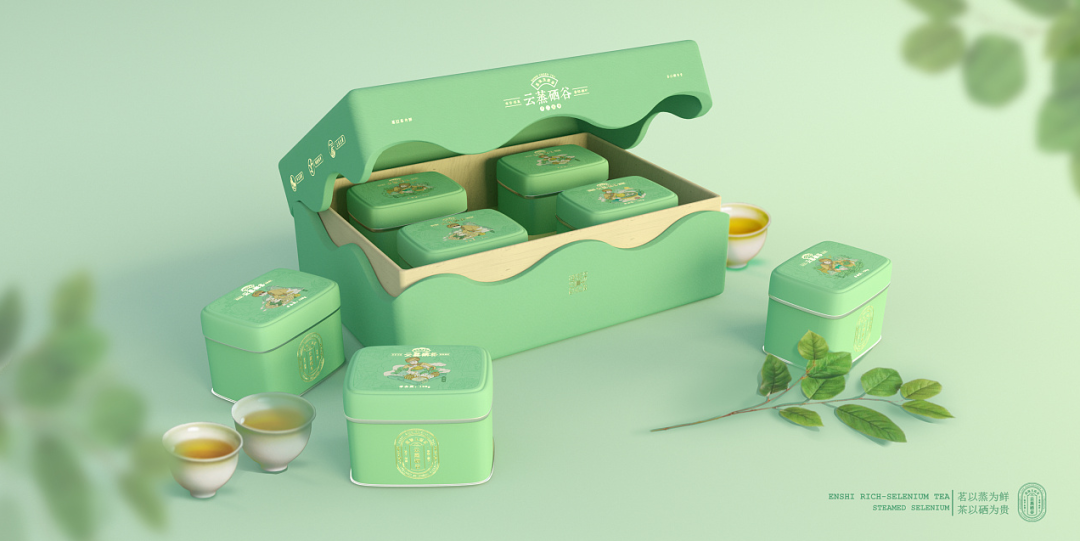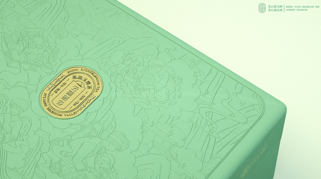 產(chǎn)自湖北的恩施玉露,是我國保留下來為數(shù)不多的蒸青綠茶,其已有上千年的制作工藝,也為包裝提供了茶文化傳承的故事性背景。外盒在傳統(tǒng)天地蓋的基礎(chǔ)上融入云霧紋樣,使用暗紋壓印著重表現(xiàn)“蒸青”的主題。LOGO處使用金屬光滑標(biāo)牌設(shè)計,整體素雅的效果呈現(xiàn)更高級獨(dú)特性。