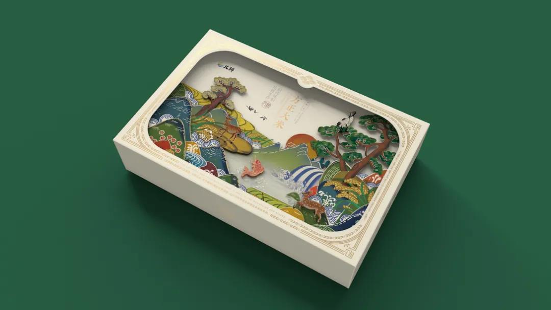 產自東北優質種植區域的凡耕大米,以“順應自然規律”為理念,憑借四季分明、雨水充足的自然條件,培育出天然、健康、優良的品質大米。首先外盒采用鏤空式設計,提取東方設計美學中常見的花紋元素,金色描邊更顯禮盒包裝的貴氣、優雅,讓消費者有種仿佛正在欣賞優秀畫作的感覺,增強整體包裝的立體感。插畫風的設計延續中國傳統美學底蘊,畫面融入了江河、田野、高山、野鹿等元素,低飽和度色調的運用營造溫馨的氛圍,日落西方的場景描繪結合米白色調,更能讓人沉浸其中。