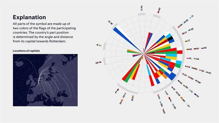 此次2021年的LOGO設計由 Clever°Franke 公司操刀,根據每個參賽國的地理位置與主辦國荷蘭鹿特丹的不同距離,通過線條組合成一個獨特的LOGO造型。新LOGO在設計上延用了去年的設計靈感,通過新舊LOGO的對比我們能夠看出新標識在細節上做出了一系列的變化。