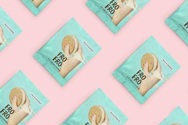 FRO FRO™是一個(gè)新的冰淇淋餅干品牌,起初主要在超市里進(jìn)行售賣。為了在眾多家庭品牌,比如Häagen-Dazs 和Ben & Jerry’s 里脫穎而出,他們的品牌設(shè)計(jì)注重給人信任感的同時(shí),添加了一些挑逗元素,以引起人們的好奇心,特別是那些孩子們。品牌的名字十分簡(jiǎn)單,特別容易讓人記住。